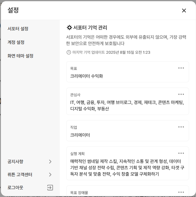 완전 무료화후 뤼튼 직접 사용한 후기를 올려봅니다. 사용전 설정에서 서포터를 설정을 하게되는데 이게 하나의 캐릭터이면서