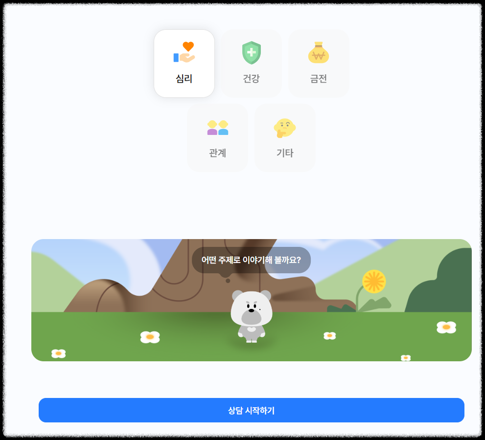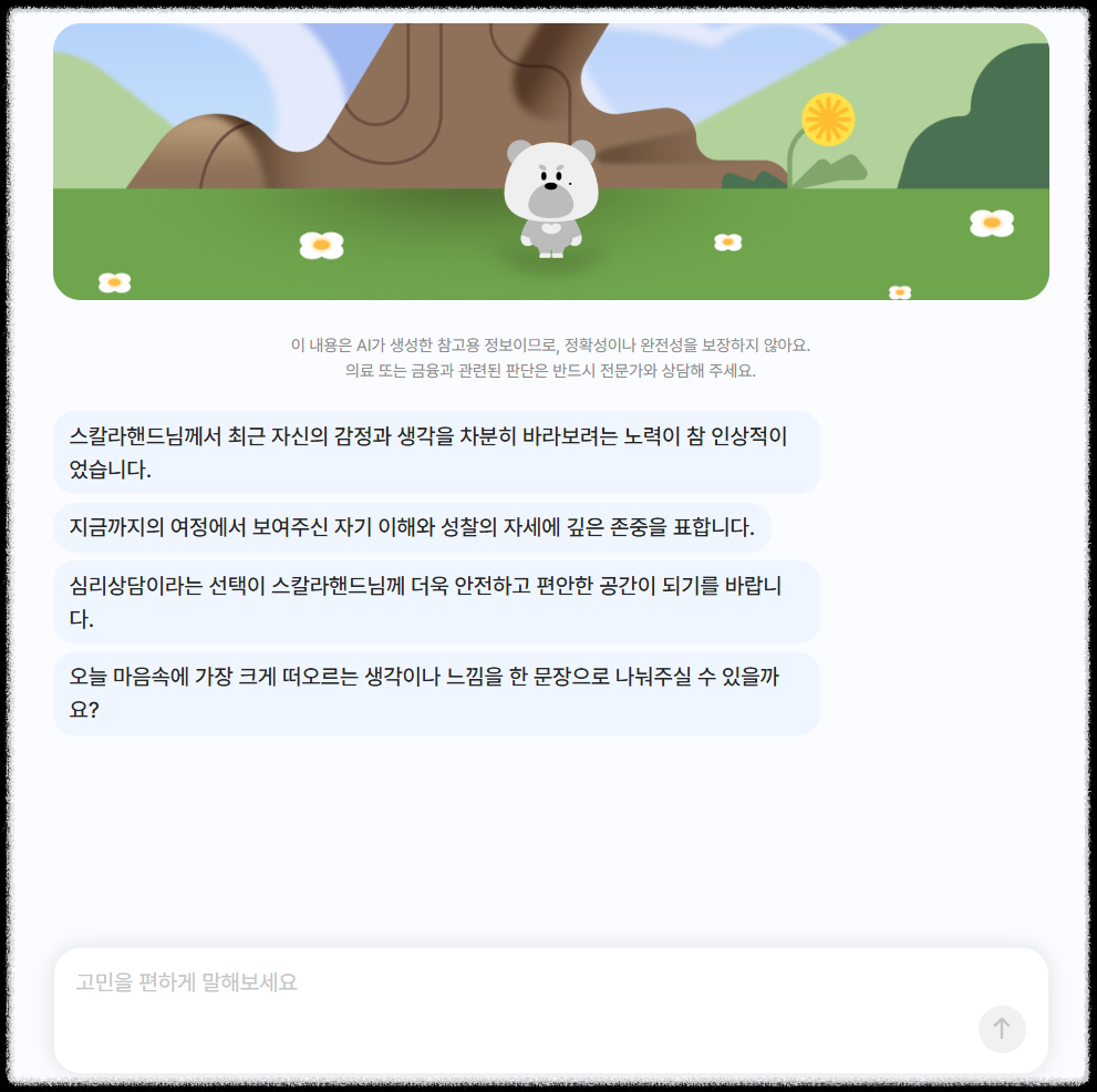상담이 필요한 경우 개인정보나 사생활 노출없이 AI와 대화하면서 고민을 해결할 수 있습니다.
