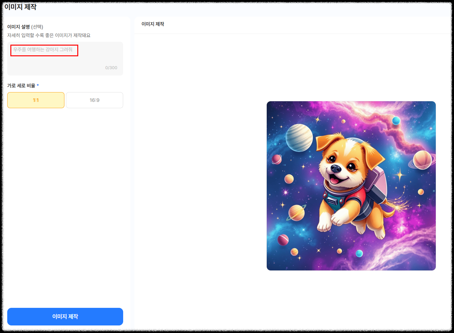 우주를 여행하는 강아지 그려줘라는 샘플 문장처럼 샘플 이미지가 그려져 있어요.