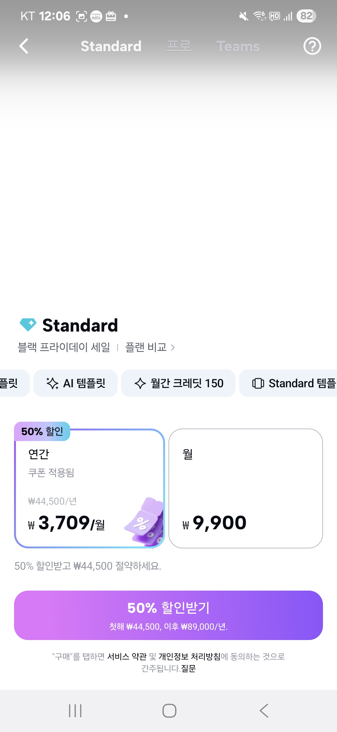 | Standard | ₩9,900 | ₩44,500(월 ₩3,709)~ | 기본 편집 + 고화질 저장 + 광고 제거 |