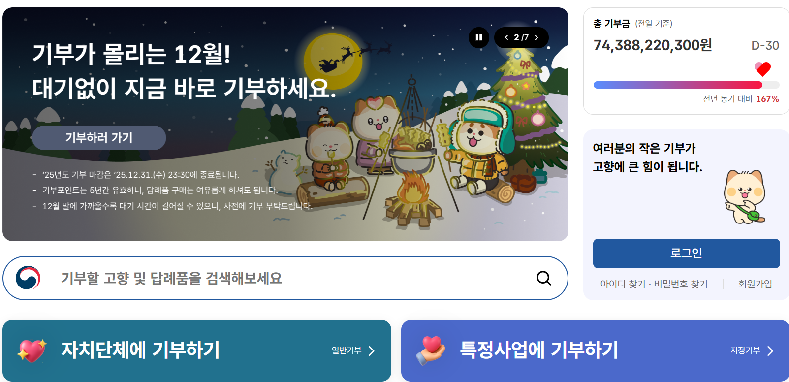- 자신의 주민등록상 주소지는 기부 불가 – 타 지역만 가능해요!